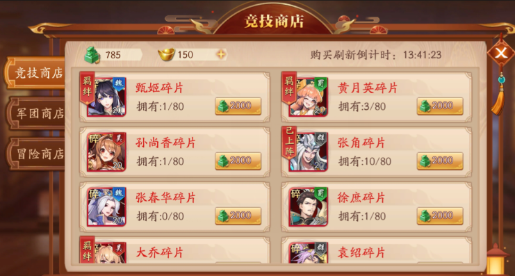 将魂商店与竞技商店聚焦于武将碎片获取。将魂商店需使用抽卡或活动积累的将魂兑换,核心策略是确定主力阵容后,集中兑换16资质核心武将碎片,若采用混搭阵容则针对性兑换所需混搭武将碎片,避免分散资源兑换非主力武将。竞技商店通过竞技场排名奖励获取货币,其购买逻辑与将魂商店一致,同样需严格围绕已确定的阵容需求兑换对应武将碎片,确保资源高效转化为核心战力。