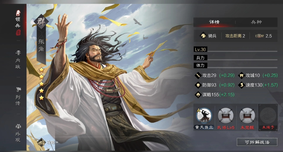 张角是一位纯粹的谋略输出核心,他的招牌技能黄天当立拥有游戏里顶尖的群体法术爆发力,还能给对手挂上持续掉血的妖术诅咒。虽然发动前需要一点准备时间,并且怕被打断,但只要顺利放出来,那毁天灭地的效果绝对值得你好好培养他。千万别因为他面板身板看起来有点脆就小瞧了,搭配得当他就是队伍里的定海神针。