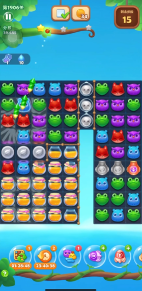 在处理中后期的复杂局面时组合高效的特效是突破障碍的核心手段。当钥匙收集完毕、左侧宝箱被打开后,版面的活动空间会增大,动物掉落也变得更为顺畅,这为制造魔力鸟与各种直线、爆炸特效创造了条件。针对左上角被小叶堆覆盖后显露的冰块以及后期成片出现的蜂蜜罐头,单一的三消效率较低,应积极尝试交换相邻的直线与爆炸特效,或者促成魔力鸟与普通特效的交换,这类组合能对特定行列或区域造成深度清除。