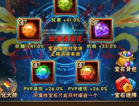 翅膀的品质决定了你能装多少颗宝石,从最常见的蓝色紫色翅膀有三个孔,到橙色翅膀有四个孔,再到后面更高级的红色、金色翅膀,孔位会越来越多。孔位多了选择就多,但怎么搭配才合理很有讲究。对于刚开始玩的玩家,如果你的翅膀只有三到四个孔,那么优先推荐镶嵌PVP增伤和PVP减伤这两种宝石,因为它们在你和其他玩家对战的时候效果特别明显。如果还有个孔位,可以考虑装一个针对特定国家的抗性宝石,比如抗蜀或者抗魏,这能让你在面对相应国家的队伍时更耐打。等你的翅膀升级到红色有五个孔时,就可以把PVP增伤、减伤和三个国家抗性宝石都配齐了。再往后,金色、暗金翅膀孔位更多,除了这些核心的功能性宝石,还可以考虑加入直接加攻击、加生命数值的宝石。记住一个原则,同一只翅膀上不能重复镶嵌属性完全相同的宝石,而且所有宝石提供的加成效果,对你所有上阵的武将都有效,所以搭配时要考虑整个队伍的需求。