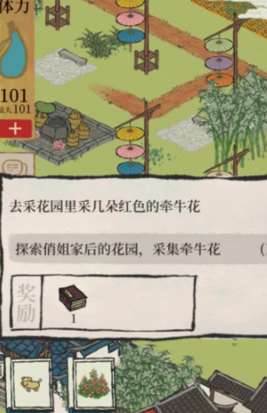 成功驱散迷雾、打开通路后,花园的全貌便会展现。玩家便可以自由探索,寻找任务所需的红色牵牛花。牵牛花就分布在已解锁的花园区域内,通常需要采集四朵。花园中往往也存在其他可采集物,例如红色绣球花,它们可能也是并行任务的目标。在探索过程中,建议顺手清理迷宫内的龙胆草、枯枝和杂草,这些杂物清理工作有时关联着其他任务或有助于完全解锁某些区域的视野。