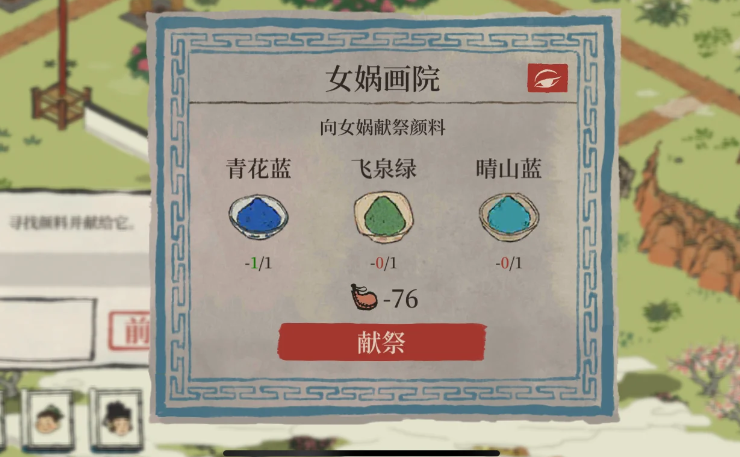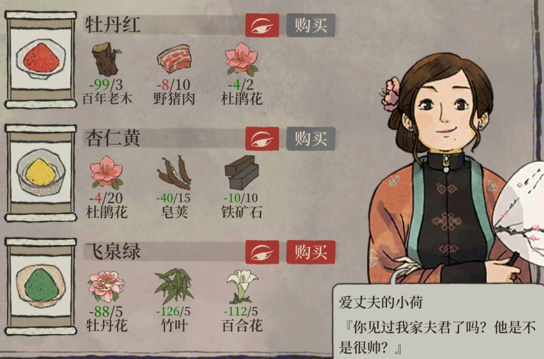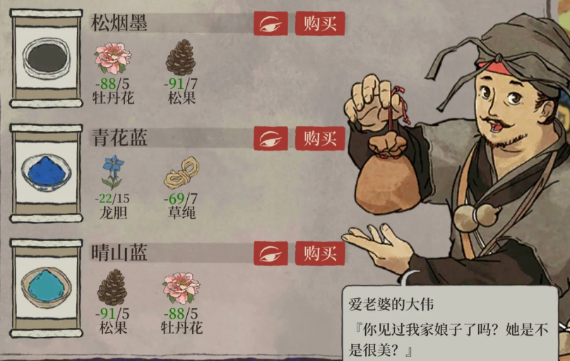 具体到驿站探险的各个地点,颜料的分布有所不同。在秦淮河畔,玩家可以在画室购买到牡丹红颜料,而在造纸厂则可以兑换杏仁黄颜料。飞泉绿颜料则可以在应天城郊地图中获得。进入丽娘府宅章节后,颜料的种类更为丰富,玩家可以在第二个商店(一个早餐摊)获得晴山蓝颜料,而青花蓝颜料则需要在兑换瓷碗花瓶的那个店里获取。松烟墨颜料在应天城郊和丽娘府宅均有出现。