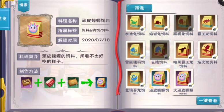 小蝾螈饲料的核心配方由三种材料构成,它们分别是优质肉、弹涂鱼饲料包以及黄豆饲料包。玩家需要确保在捕捉前,按照准确的配方比例准备好足够数量的饲料包,这是成功驯服小顽皮蝾螈的首要且最关键的前提。捕捉小蝾螈所需的饲料保底数量通常为20包,但建议在此基础上多准备一些,以应对可能出现的意外情况,避免因饲料不足导致捕捉过程失败。整个饲料的制作流程需要玩家耐心收集和合成,不可临时拼凑材料。