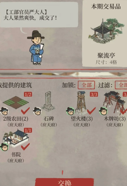 给城市添置些漂亮的家居装饰,最直接的方法之一就是找城里的NPC交易。游戏里有一位四处游走的严大人,他会不定期出现在你的城市,并带来一些独特的建筑和装饰物。你可以使用自己仓库里储存的多余建筑或装饰品与他进行交换,这是一种资源置换的好途径。游戏界面右下角偶尔会出现的杂货摊也是一个兑换点,你可以用补天石、铜钱或者其他活动道具直接购买到心仪的建筑或景观,丰富你的江南小镇。