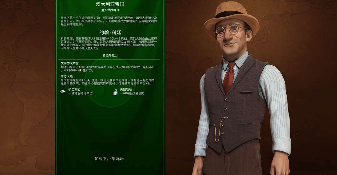 澳大利亚的核心优势来源于其领袖约翰·科廷的特性文明的大本营。该特性规定,若澳大利亚被其他文明宣战,则在接下来的10回合内全国所有城市的生产力翻倍;若澳大利亚解放了一座城市(例如从其他文明或城邦手中解放),则获得为期20回合的全国生产力翻倍。这个效果是玩好澳大利亚的关键,理想状态下玩家应设法在整局游戏中尽可能保持这个增益效果不间断。早期可以通过故意在边境拍脸建城、拒绝AI要求等方式引诱AI宣战来触发;中后期则可以通过密切关注战局,主动解放被其他文明攻占的城邦或城市来获得更长的加成期。在生产力翻倍期间,澳大利亚的建造、暴兵速度将变得极其恐怖,是实现任何胜利目标的强大引擎。