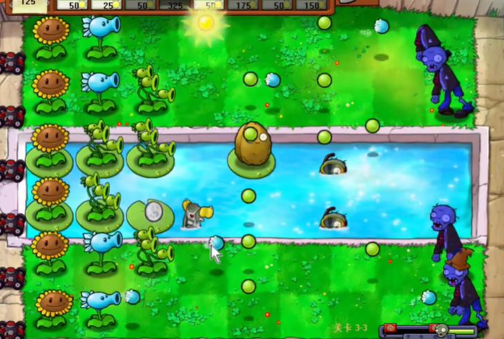 3-3关的过关核心在于巧妙运用融合植物和建立稳定的阳光经济体系,你需要开局迅速建立稳定的阳光生产并灵活运用防御型植物抵挡前期的攻势冲击。开局时在第一竖列全部种上向日葵,然后立即将它们融合升级为双子向日葵,以确保充足的光照资源为后续布局提供保障,根据关卡环境如深夜池塘或浓雾可以在水域种植小河向日葵或在陆地部署阳光小喷菇,这些融合植物兼具防御与阳光生产功能能有效应对早期僵尸的进攻。