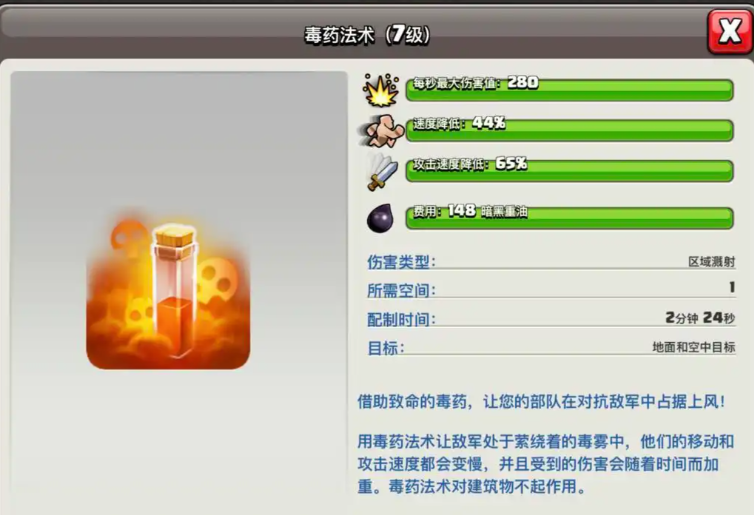 伤害法术的实用性体现在其多样化的功能机制上,能够应对不同的战场需求。雷电法术能对区域内所有敌方单位造成稳定的范围伤害,特别适合针对密集摆放的关键防御建筑或援军进行定点清除,其伤害均匀且范围固定,是高效率拆除特定目标的可靠选择。地震法术则拥有独特的百分比伤害机制,能够按建筑当前生命值的比例削减其血量,对城墙有额外破坏效果,擅长快速瓦解城墙体系并为后续部队开辟通道,其作用随等级提升而扩大,性价比显著。毒药法术专精于对抗敌方有生力量,其释放的毒雾能持续造成递增伤害并大幅减缓敌方援军或英雄的移动与攻击速度,虽对建筑无效,却是压制敌方核心作战单位、为己方创造输出窗口的绝佳工具。蝙蝠法术能够召唤大量飞行单位进行突袭,具备高爆发能力,尤其擅长在配合控制法术的情况下快速削减特定的防空火力或区域防御建筑。