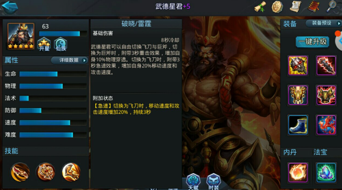 快速提升武德星君的等级,首先得明确他的核心优势。这家伙是个全能型战士,近战远程都能玩得转,尤其擅长克制佛族英雄,比如地藏菩萨。他的技能设计特别有趣,能切换飞刀和巨斧两种形态,飞刀形态加攻速移速,巨斧形态加物理穿透,打起来灵活多变。升级重点要放在技能联动和装备搭配上,篝火和排行榜是他发光发热的主战场。