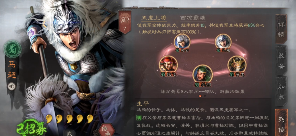 马超作为蜀国五虎上将之一,在游戏中定位为强力物理输出武将,其自带战法槊血纵横能提供稳定的群体伤害。该战法在战斗中提升自身武力属性并赋予群攻状态,担任主将时群攻效果进一步增强。由于马超的伤害机制依赖普通攻击触发,因此战法搭配需围绕连击和群攻展开,例如兵锋、强攻等连击类战法可显著提升输出效率,而一骑当千等突击战法则能补充爆发伤害。