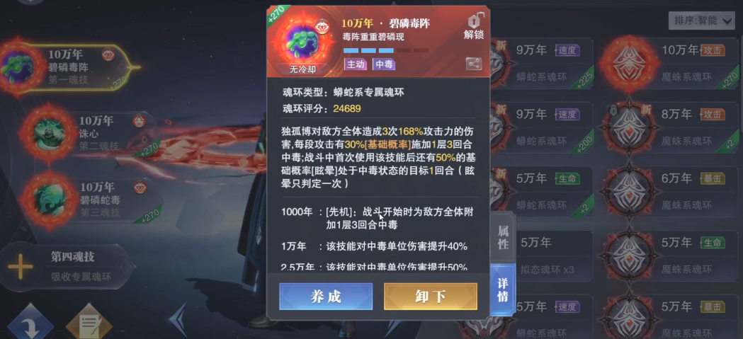 马红俊的第四魂技凤凰炽焰焚需搭配猛兽系魂环延长灼烧时间,独孤博的第一魂技碧磷蛇毒建议配置五万年魔蛛系魂环以提升中毒触发概率。辅助角色宁荣荣推荐七宝之御与玲珑双甲盾系魂环,增强团队护盾与属性加成。魂骨选择上优先为输出角色配备增加暴击率或技能效果的散件,辅助角色则以生命值、速度加成为主。