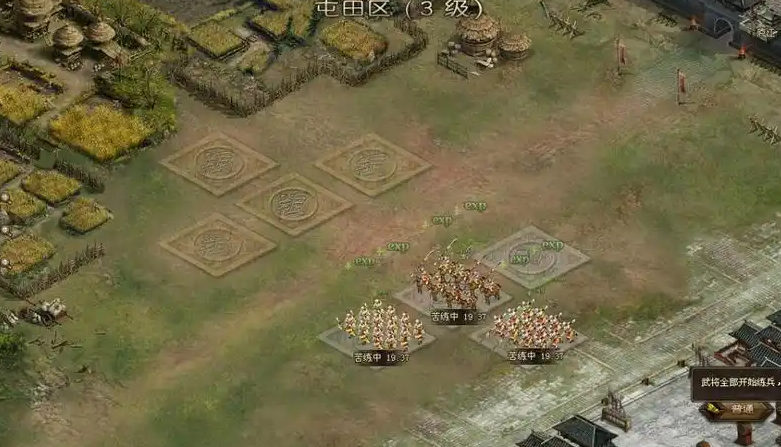 练兵是提升部队实力的核心手段,主要通过屯田区、练兵符和特殊道具实现。屯田区是最基础的练兵场所,分为不同等级,级别越高获得的经验或粮食收益越显著。一级屯田区提供3000粮食或3200经验,二级屯田区可产出26350粮食或29750经验。玩家可通过消耗屯田令选择全体练兵、苦练或屯田,武将等级越高,练兵收益越大。练兵效率与屯田区级别直接相关,需优先投资升级。