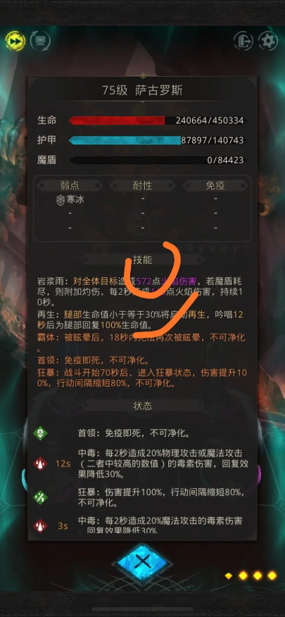 四名叠毒角色的技能需精确调整,确保其攻击或技能能稳定对BOSS腿部施加中毒效果,通常需关闭其非必要技能或单体攻击,将技能目标锁定为腿部并保持中毒技能的全程开启。两名治疗者则专注于群体治疗技能,其战吼技能应设置为手动或错开使用时机,避免治疗资源浪费。战斗开始前可食用提升火焰抗性或生存能力的水果布丁类食物。进入战斗后,首要操作是手动选定BOSS腿部为攻击目标,确保所有叠毒角色的攻击均集中于此,并实时监控腿部所挂中毒层数,必须全程维持三层满额中毒效果,这是阻止其回血的关键。
