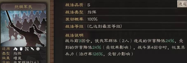 抚辑军民是一款强力的减伤战法,核心作用在于战斗前几回合大幅降低我方两名武将受到的伤害,并在第四回合提供稳定的兵力恢复,有效提升队伍的生存能力。这一战法特别适合慢速队伍,如司马盾或魏法骑,因为这些队伍需要前期扛住敌方攻势,积累后期优势。相比其他减伤战法,抚辑军民的独特之处在于同时兼顾防御和恢复功能,形成攻防一体机制,但需注意其在前几回合会降低我方武将的输出能力,因此更适合依赖指挥或被动输出的阵容。