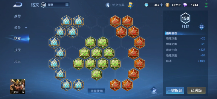 红色异变与绿色鹰眼共同构成100点物理穿透,大幅提升前期伤害。蓝色铭文选择隐匿,其提供的物理攻击增强普攻与技能输出,10%移速加成则完美契合关羽被动机制,使冲锋姿态更快触发,提升游走与切入效率。整套铭文最终属性为物理攻击+36、物理穿透+100、移速+10%,在进攻性与机动性间取得平衡。
