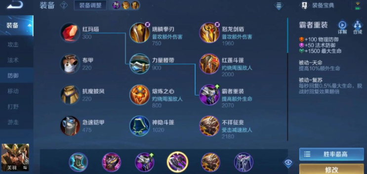关羽作为高机动性战士,出装需兼顾移速、生存与输出。首件装备必选鞋子,影忍之足提供物理防御与减伤,抵抗之靴则针对强控阵容,移速加成对关羽被动至关重要。核心装备选择半肉半输出路线,暗影战斧是核心攻击装,提供物理穿透、冷却缩减及生命值,强化技能伤害与释放频率。中后期补充不祥征兆和魔女斗篷,前者提升物理防御与血量,被动减攻速移速效果能有效限制敌方输出;后者提供法术防御与护盾,对抗法师消耗。最后两件可根据战局调整,破甲弓应对高护甲阵容,反伤刺甲增强物理反制,贤者的庇护则提供容错空间。
