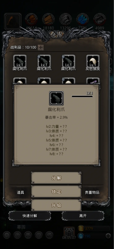 战利品系统最大的乐趣就在于随机性,没有绝对最好的只有最适合的。巨狼心脏能增强力量同时提速,铁甲碎片适合防御型角色,血眼这种能提升命中和速度的稀有物品更是可遇不可求。刷战利品时保持平常心,每天把五次机会用在刀刃上,慢慢积累总能凑齐心仪的套装。