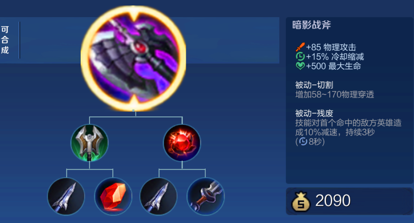 第一件输出大件认准暗影战斧准没错。这件装备提供的物理攻击、冷却缩减和物理穿透,完美契合咱们亚瑟的技能需求。有了它,咱们一技能接强化普攻再接二技能的连招伤害会明显提升,冷却缩减也让咱们能更频繁地使用技能去骚扰和追击敌人,装备附带的残废效果还能减速对手,配合咱们的一技能加速,粘人能力直接上了一个台阶,前期单挑和小规模团战能力大大增强。