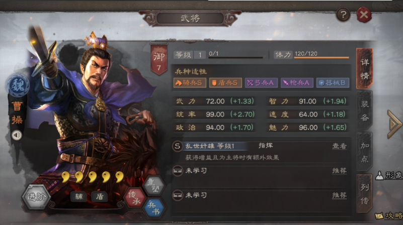 他的兵书得往军形路线走,核心是点出严阵以待和守势。严阵以待能让曹操大哥分担掉兄弟们受到的一部分伤害,这可是保命的关键;而守势能在战斗前期额外提升曹操大哥的统率或智力,让他开场就更硬,更好地保护全队。第三层兵书推荐选铁甲,进一步减少受到的兵刃伤害,或者选防备来降低全体受到的伤害,让整个盾阵更稳当。