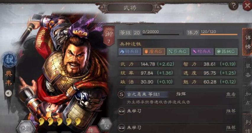 顶在最前面挨揍的典韦大哥,兵书必选九变路线。核心要点出三里而返,这可是神技!当他受到普通攻击时,有几率让攻击者陷入技穷或者缴械,既能打断对手进攻节奏,又能配合他自己的反击本事,揍人更疼。另一个关键点是守势,和曹操大哥一样,提升开局时的硬度,站得住才能持续保护队友。第三层兵书可以选择救主,关键时刻替主将曹操大哥扛点伤害,或者选励军时不时给队友加点伤害,都很实用。如果咱们的典韦大哥带了嘲讽类战法拉仇恨,那无战而胜也能考虑,额外减点受到的谋略伤害。