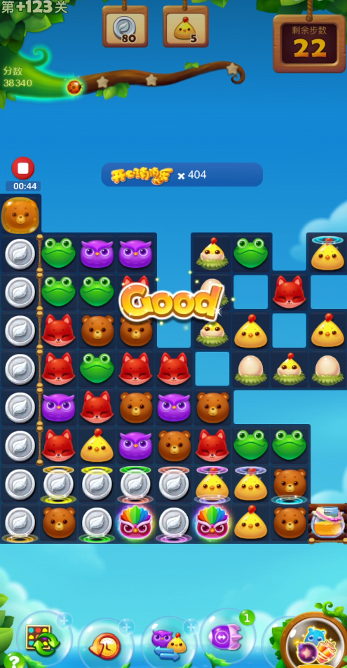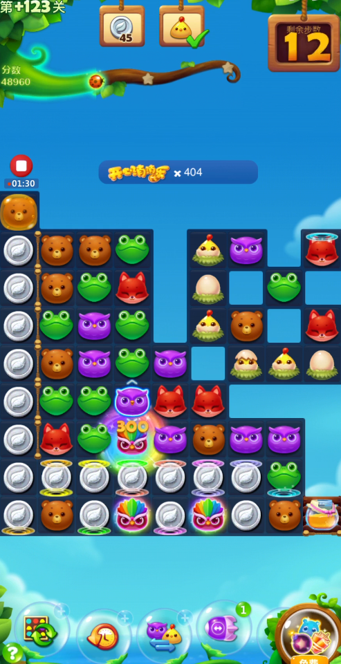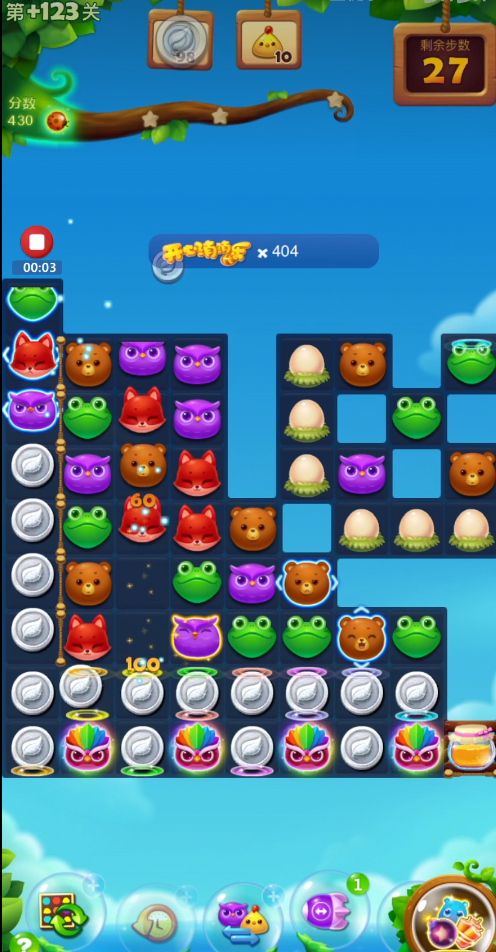 开心消消乐123隐藏关的核心通关目标是在限定步数内获得25万分或成功清除位于地图右侧区域的三个小豆荚。该关卡布局设计复杂,存在冰冻块、双层冰块以及铁链块等多种障碍物,对玩家的观察力和策略规划要求较高。豆荚作为关键目标,其下落路径常被障碍物阻塞,因此开局必须迅速分析整体结构,优先消除阻挡豆荚移动的障碍。特效组合在本关至关重要,爆炸特效或魔力鸟能有效打开局面,为后续操作创造空间。