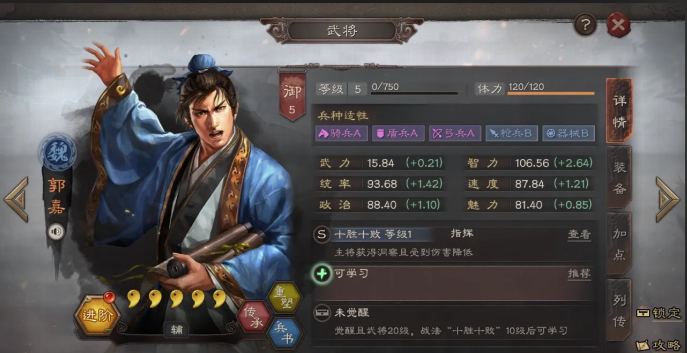 兵书的选择得和咱们的加点方向保持一致。如果走的是辅助路线,九变系的诱敌之策或者励军就非常实用,能进一步提升郭嘉保护队友的能力。要是选了全智力加点想稍微强化下输出或治疗,虚实系里增加谋略伤害或治疗效果的兵书也能锦上添花。可千万别混着点辅助和输出类的兵书,那样效果反而会打折扣。郭嘉的兵种适应性挺灵活的,骑兵、盾兵、弓兵都是A级,咱们完全可以根据队伍需要来调整。比如把他放在骑兵队里,搭配虎豹骑能提升全队的突击战法发动几率;放在盾兵队时配上藤甲兵又能大幅增强物理抗性。