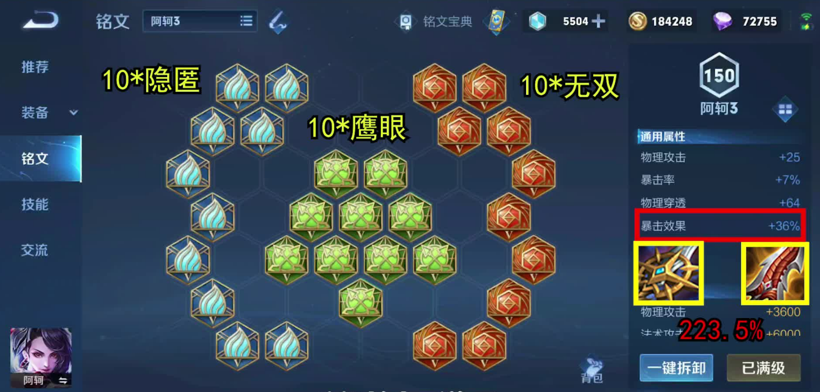 阿轲的打野出装核心思路是充分利用她的被动技能——在敌人背后攻击必定暴击,因此你需要优先选择提升暴击伤害和生存能力的装备。无尽战刃是关键装备,它能大幅提高暴击率和暴击效果,让你的背后突袭更具威胁;暗影战斧提供冷却缩减和物理穿透,帮助你在前期快速清理野怪和支援队友。装备顺序上,建议先从打野装起步,再逐步升级到输出核心,这样能确保你在游戏各阶段都有稳定的发育节奏 。阿轲的玩法依赖隐身切入和爆发输出,出装时要避免纯肉装或攻速装,而是专注于暴击和穿透属性,这样你才能在团战中精准秒杀脆皮目标。