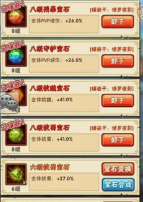 宝石分为三大核心类型:红宝石主攻攻击力提升,适用于追求伤害输出的角色;蓝宝石强化防御属性,适合承担前排抗伤职责的武将;绿宝石则专注生命值加成,增强整体生存能力。这三类基础属性宝石构成镶嵌策略的基石。更高阶宝石可通过合成系统获取,即消耗三颗同级同类宝石生成一颗高一级宝石,但已镶嵌的宝石需卸下方可参与合成。