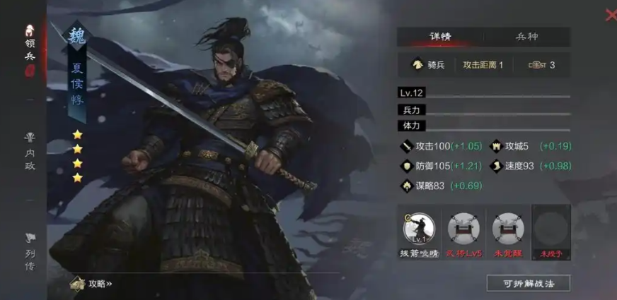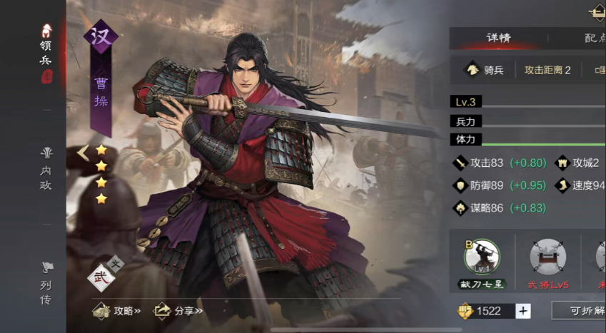 在培养方向上曹操更偏向团队增益而非主力输出,因此战法推荐搭配反计之策或攻其不备这类控场技能。属性培养上优先提升谋略和防御,以最大化辅助效果。如果抽到重复的曹操卡不要急于分解,用于进阶提升红度能显著增强属性。曹操虽然强力但并非不可替代,如果暂时没抽到也不必着急,可以先培养其他武将过渡。他的站位通常放在中军或前锋位置,利用其稳定的身板为团队提供支持。