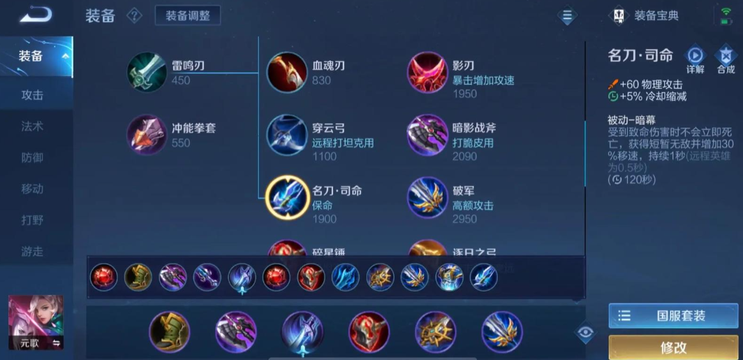 具体的装备方案可根据对局定位灵活调整核心装备暗影战斧是必出的选择,它提供物理攻击、冷却缩减和穿透效果。对于追求极致爆发的打法,中期补上破军能大幅提升收割能力,而碎星锤则用于应对敌方坦克的护甲。若需兼顾一定的生存能力,可以选择冰痕之握来提升防御并提供减速控制,或在后期补足名刀·司命、贤者的庇护来增加容错率。打野玩法的元歌则需要将鞋子替换为追击刀锋,以提升野区资源获取效率。
