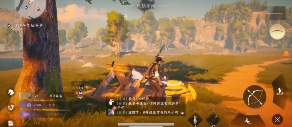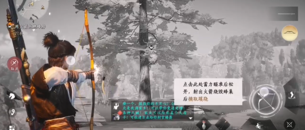 在锁定蜂窝目标后使用火箭或弓箭对其进行射击。攻击的目的在于点燃蜂窝或直接将蜂巢击落,从而驱散或消灭守护的蜜蜂群。在成功使用远程武器完成攻击后,观察现场,等待威胁解除,便可以安全地靠近蜂巢残骸。此时靠近会出现采集互动提示,点击进行收集即可将蜜蜂窝收入囊中。成功采集后玩家将直接获得蜂巢道具此物品本身可能作为烹饪或制造的材料使用。
