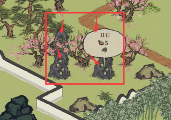 关于巨石和丑石的位置,有较为具体的描述可供参考。巨石通常位于两个围墙中间,是一个显眼的黑色大石头。在接近它的路径上,往往会有竹子阻挡,因此需要先砍掉这些竹子才能开辟出通往巨石前的道路。而四块丑石则分布在围墙的外围,它们是解开巨石封锁的关键道具。完成清除巨石的任务后,原本被阻塞的区域通常会开放,玩家有可能在其中发现宝箱奖励。在沿路清理竹子的过程中,有时也会发现需要种植桃花树的坑位,这属于地图探索的连带内容。