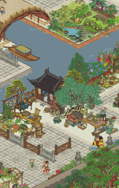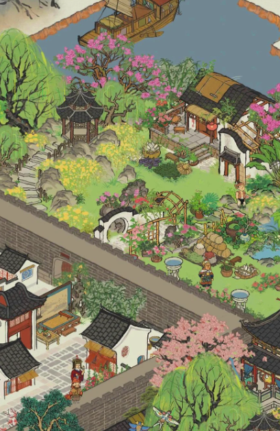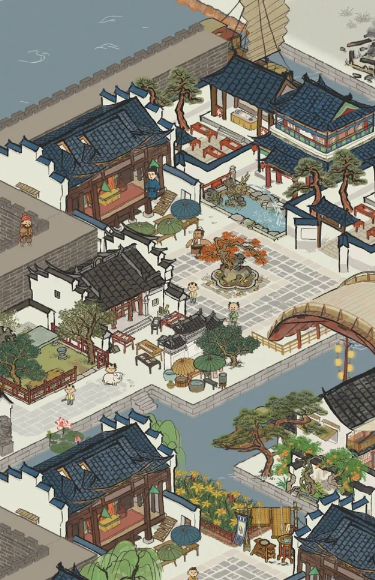 游戏中的每个府城都有其独特风格与专属建筑,例如应天府作为起点,需要你建立起从农耕、林场到商业的完整循环;而苏州府则引入了刺绣、养蚕等特色产业;杭州府则新增了茶叶、团扇等特产。后期解锁的白雪镇终年银装素裹,拥有祈福梅花树和系列小摊建筑,为你提供了全新的雪景布局主题。绍兴府的越州商行和松江府的盐商经营,则是更进阶的玩法,要求你在城市布局中为其供应链预留空间,并考虑货架朝向、顾客动线等细节以实现高效运营。