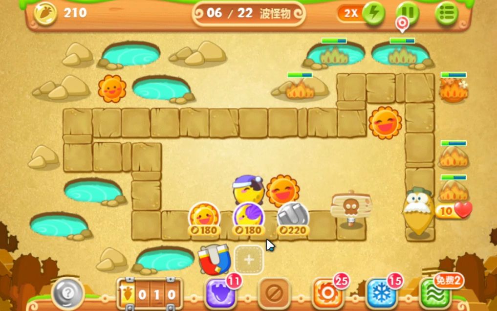 中期在中间章鱼上方与右侧章鱼下方补建汽油瓶炮塔,萝卜右上方再加一座章鱼辅助覆盖全图,月亮塔解锁后立即放置在怪物路径拐角处,减速效果能让主力输出有充足时间集火,避免高速怪物突破防线。此时重点升级已有的章鱼、汽油瓶与手电筒,优先把核心输出拉满,剩余金币用于补建瓶子炮与多重箭,填补近距离攻速缺口,面对成群小怪与重型怪物时,多重箭的穿透伤害配合汽油瓶的持续灼烧,可快速压低血线,防止怪物扎堆靠近萝卜。