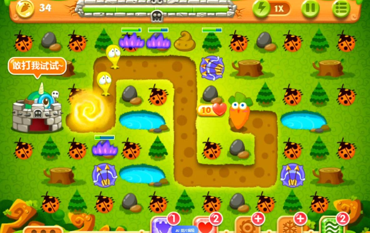 保卫萝卜2第127关采用章鱼炮塔核心清场、月亮塔减速控场、汽油瓶补伤害的组合,配合快速清理隐藏道具获取额外炮塔,可稳定拿到金萝卜并完成全清任务。开局优先在萝卜左侧核心位置放置章鱼炮塔并快速升级,利用大范围攻击同时处理怪物与周边松树、木材类障碍,右侧空位补充第二座章鱼炮塔,集中火力攻击橡胶船道具,打破后会出现手电筒炮塔,直接升至顶级强化远程输出,全程不售卖解锁的隐藏炮塔,依托范围伤害兼顾清怪与清图,大幅降低后续防守压力。