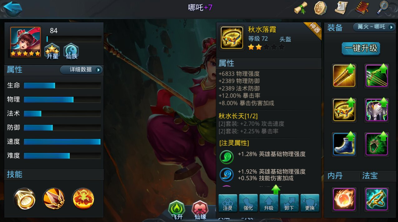 内丹加点需根据场景灵活切换,PVE玩法中全程点满物理强度,最大化篝火与闯关的输出效率,配合罗睺、法相经文,技能衔接普攻可频繁触发额外法术伤害,快速压低BOSS血线;PVP与排行榜玩法中改为全生命值加点,提升战场存活时间,依托烈阳护盾与大招突进,在团战中持续骚扰后排,配合飞升技能的三段攻击眩晕概率,可多次限制敌方核心输出。装备选择以攻速、暴击、物理穿透为主,攻速堆至40%阈值即可避免溢出,剩余属性补暴击与穿透,武器选用五虎断魂,鞋子搭配追星踏月,进一步强化输出与机动性。