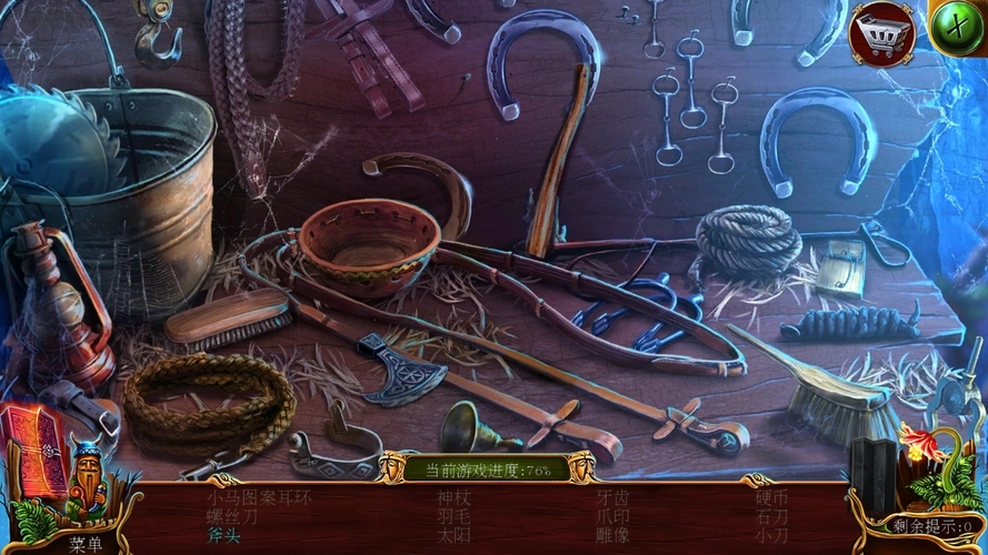 寻物过程中需注意场景细节,城墙钩区域的倒钩藏在马匹后方的墙面凹槽处,被马匹遮挡无法直接看到,必须先完成马鞍小游戏移开马匹才能显现,小游戏操作需按照提示调整部件位置,确保镶嵌部件与马鞍卡槽精准契合,完成后马匹会自动移开,此时墙面凹槽处的倒钩清晰可见,点击即可拾取,拾取后道具栏会显示倒钩图标,可随时查看是否获取成功。