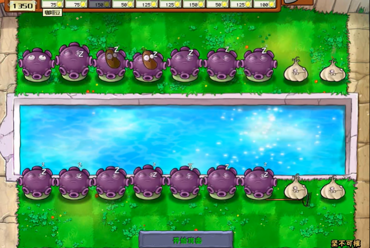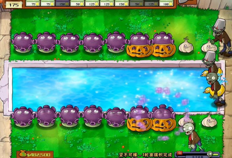 阳光分配需遵循攻防平衡原则,输出植物占比约60%,防御植物占比30%,预留10%阳光作为应急储备,用于补充破损的高坚果、地刺王或临时使用樱桃炸弹、寒冰菇应对密集僵尸潮。忧郁菇搭配大蒜的组合可作为备选方案,大蒜改变僵尸行进路线,让忧郁菇的范围攻击覆盖更多目标,适合追求低成本高效输出的布局思路,两种方案均可根据僵尸波次特点灵活调整。