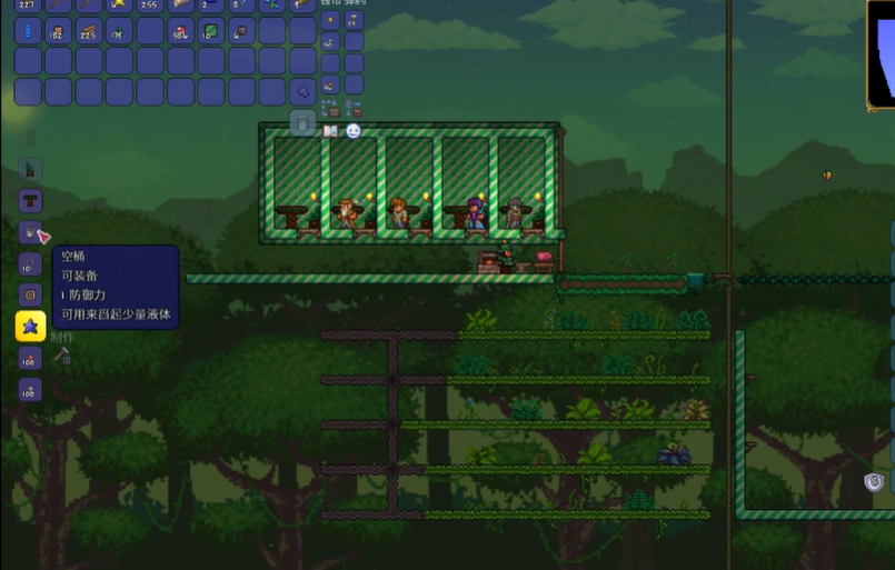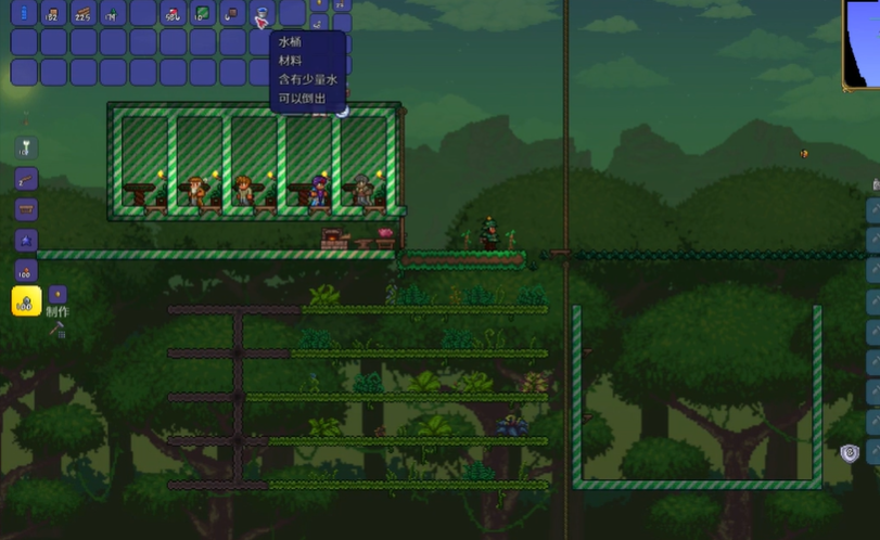 空水桶的核心功能是盛装与转移液体,可对水、岩浆、蜂蜜三种常见液体进行收集与放置,单次操作可装填一格液体,使用时对准足量液体点击即可完成装填,对应变为水桶、岩浆桶或蜂蜜桶,再次点击地面就能将液体放置在目标位置,操作简单且实用性拉满。在探索过程中,水桶能快速处理危险地形,比如用岩浆桶布置防御陷阱阻挡怪物追击,用水桶浇灭燃烧环境避免持续掉血,蜂蜜桶则可随时放置创造回血区域,提升野外生存能力。同时,水桶也是地形改造的关键工具,在地下挖掘时可快速封堵渗水区域,搭建人工水域满足钓鱼条件,还能通过水与岩浆的组合制造黑曜石,为后续高级装备合成储备材料。