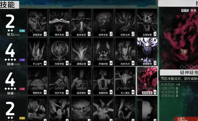 开局加点建议优先考虑智力系和精神系技能,比如博学多识、标新立异、内陆帝国等,这些技能能帮你在对话中解锁更多剧情线索。体力加到2点足够,主要用来防止猝死,身手可以保持在2-3点。开局推荐4-4-2-2的分配,这样能平衡探索和剧情体验。加点时别急着全用完,留一些点数应对关键任务检定,比如遇到重要对话或解谜时再针对性提升。