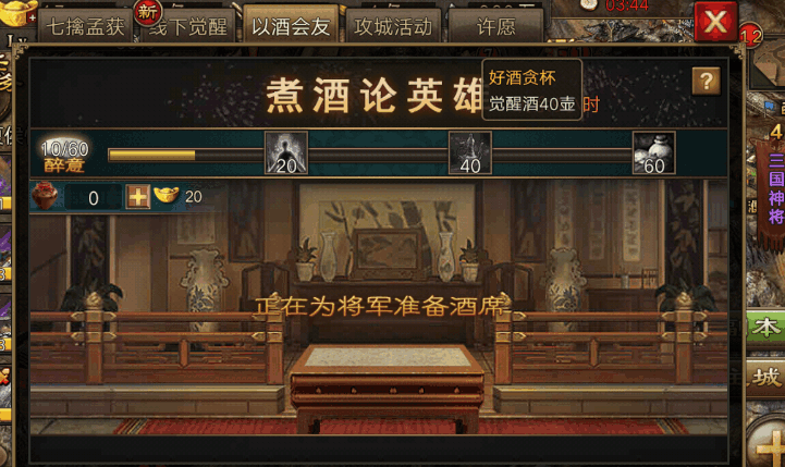 获得觉醒的酒,咱们可以从最基础的煮酒论英雄活动开始。这个活动是获取觉醒酒最主要的途径,参与方式简单,奖励也相当丰厚。通过完成世界地图上的事件任务,比如运送货物或者防范山贼,都能随机获得美酒奖励。如果成功保护城池稳定,还能额外领取觉醒酒。酒席互动也是不错的选择,和其他玩家饮用相同的美酒时,能免费拿到觉醒道具。