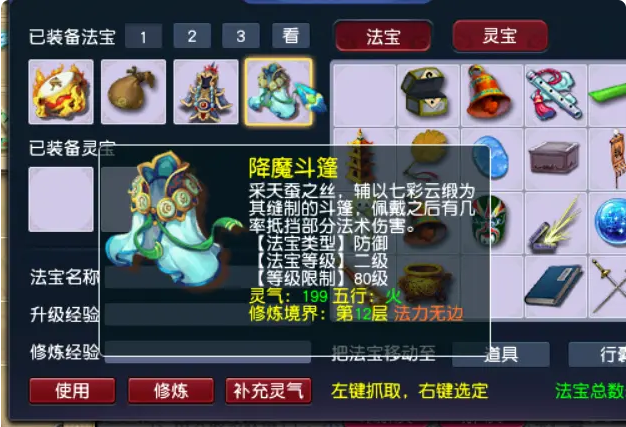 玩69级化生寺,法宝搭配可是提升治疗和生存能力的关键。被动法宝格子优先带两个碧玉葫芦,这是咱们吃饭的家伙,能大幅提升推气过宫这些治疗技能的效果量,让队友的血线稳如泰山。另一个被动格子通常选金甲仙衣或者降魔斗篷,金甲仙衣主要防物理点杀,降魔斗篷则针对法系爆发,选哪个得看平时遇到的对手类型。它们最好都选太阴属性,像葫芦太阴能在关键时刻多给点治疗暴击惊喜,斗篷太阴也有几率把吸收的伤害转化成咱们自己的气血,特别实用。风袋也是常备选项,抢速度线必备,少阳属性开场加物抗也挺香。
