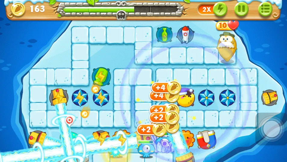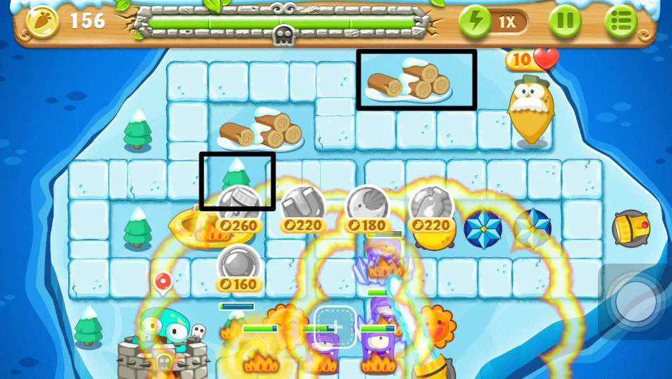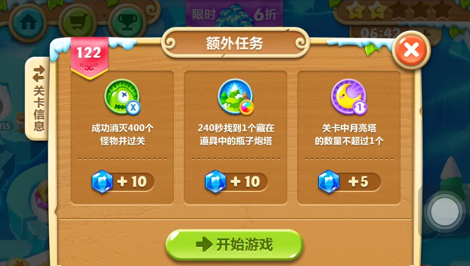 开局阶段需在右下方位置建造一个汽油瓶炮塔并立即升至满级。在下一波怪物出现前,优先利用汽油瓶攻击其上方的场景道具;怪物出现后需及时切换目标。待上方道具被清除后,将出现冰锥炮塔,应继续清理冰锥上方的道具,并在附近建造一个月亮炮塔辅助清除周边障碍。此阶段需同步升级所有炮塔,道具完全清除后将出现两个雪花炮塔。月亮塔数量需严格控制在1个以内,否则将无法完成额外任务。