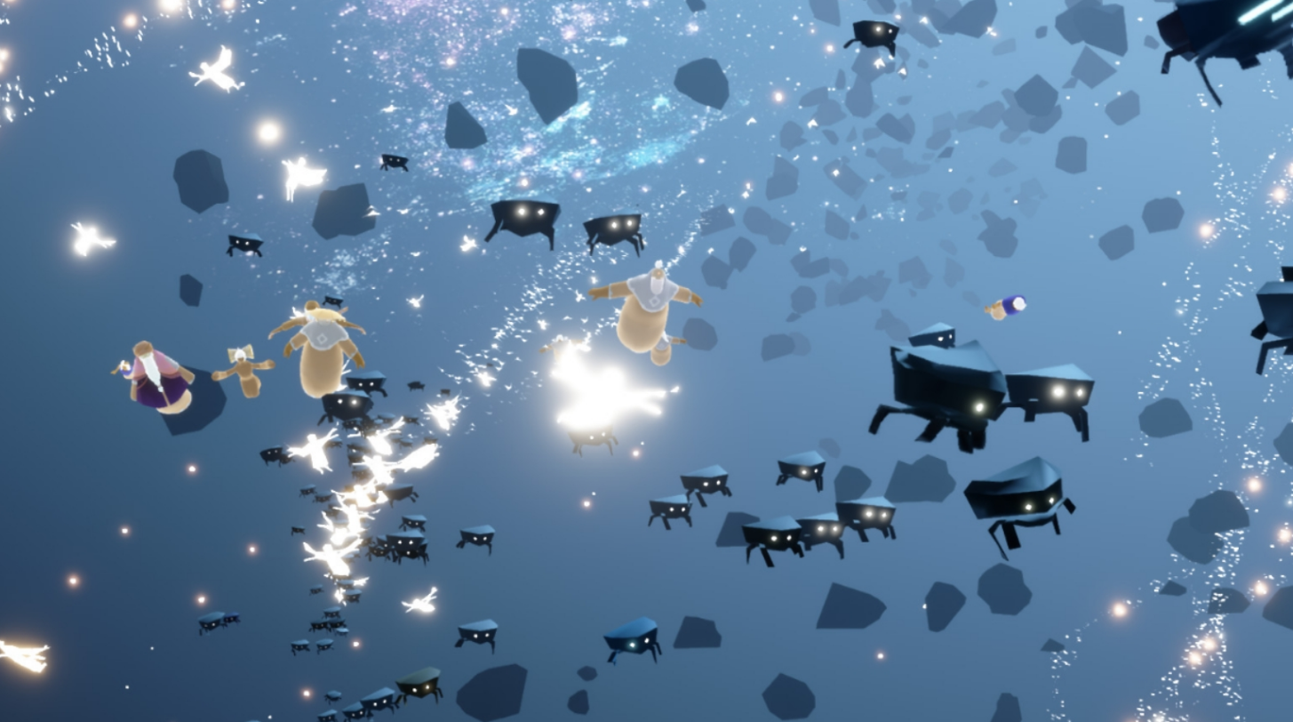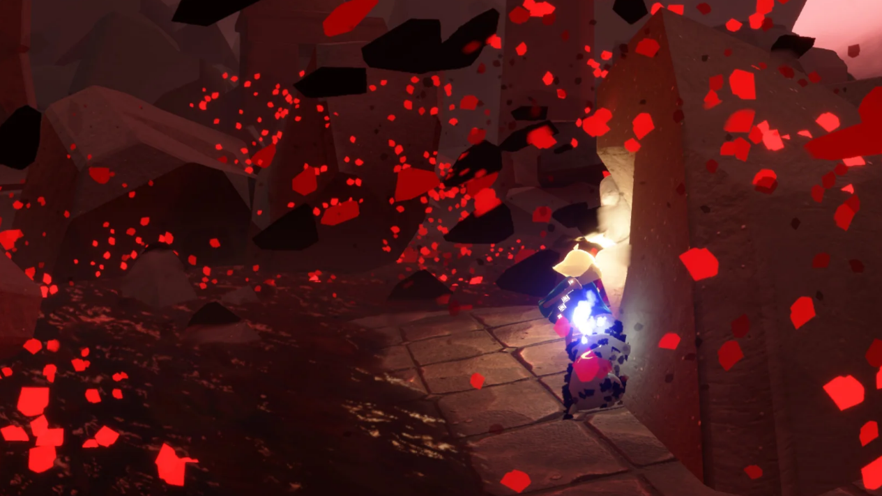 一路披荆斩棘到达最顶层的献祭区域,小可爱们的任务就是用身上的光翼去点燃沿途那些冻住的小黑人雕像。靠近他们,消耗自己的光之翼去温暖他们吧。这里的红石雨更密集,伤害也更大,宝贝们只能顶着伤害硬冲了,尽量多救几个小黑人是目标。别心疼光翼,在这里它们注定是要全部献出去的。当最后一个光翼也献祭出去后,咱们的角色会倒下,但这恰恰是重生的开始。