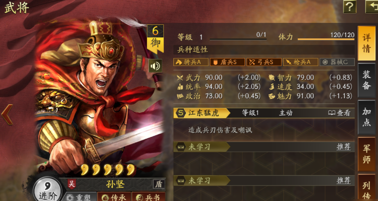 新手推荐以物理输出为核心的菜刀队,因策略队需高阶战法支撑稳定性。核心思路是主坦+辅助+输出:主坦位选择自带减伤或反击的武将(如程普、郭淮),搭配援护或嘲讽类战法吸引普攻;辅助位可携带治疗或净化战法;输出位优先配备高发动率的主动战法。部分低门槛武将如孙坚,既可依托嘲讽机制配合反击流战法(如骑虎难下),也可在增伤辅助下走爆发路线。需注意兵种适性,S级适性提供120%属性加成,直接影响战法效果。