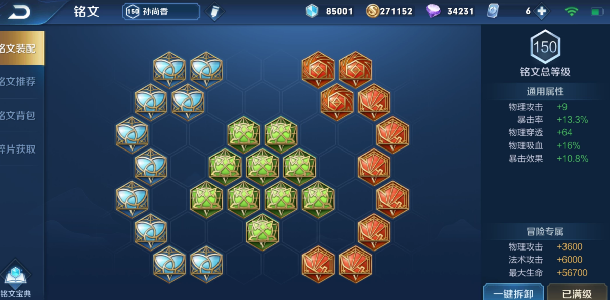 铭文首选10夺萃+10鹰眼+7祸源3无双。这套组合给咱们提供了16%物理吸血和13.3%暴击率,绿色鹰眼保证前期穿透,红色混搭平衡暴击效果。蓝色夺萃让前期续航无忧,省下泣血之刃的格子加速核心装备成型,红色祸源补足暴击概率,3个无双配合无尽战刃刚好卡满暴击效果上限。出门就有平A回血和稳定暴击,清线发育特别舒服。