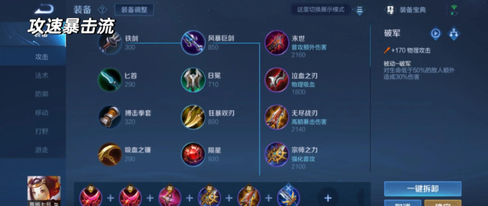 要是对面坦克英雄特别多,堆了一身护甲,或者你家队伍缺破甲手段,穿透流会更合适。这种思路下,攻速装备可以少出一件,把钱花在刀刃上,优先保证物理穿透和暴击效果。破晓依然是核心,它提供的百分比破甲对小鲁班被动这种按生命百分比计算的伤害加成巨大。可以早点做陨星(合成暗影战斧或碎星锤的小件)来过渡,暗影战斧提供的冷却缩减和固定穿透,能让小鲁班的技能衔接更流畅,对脆皮威胁也更大。无尽战刃还是得出,暴击伤害不能丢。这种出装虽然攻速慢点,但每次被动扫射打在前排身上都特别疼。