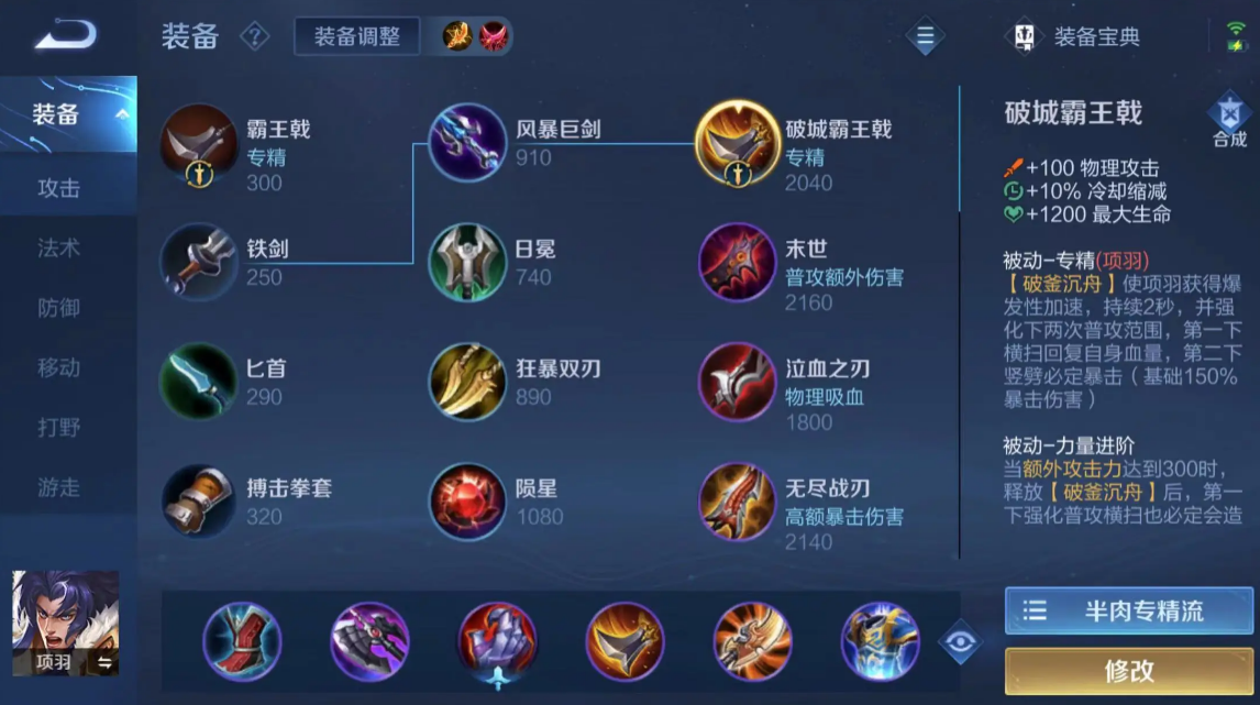 破城霸王戟作为项羽的专精装备,是两种流派的核心首选项。该装备大幅强化二技能效果,使项羽的推击具备更远距离与更高伤害,同时降低目标输出能力。其被动提供的物理防御与生命值转化效果,完美契合项羽被动技能的减伤机制,显著提升其战场存活率。优先合成这件装备能有效增强项羽前期的线权争夺与小型团战影响力。