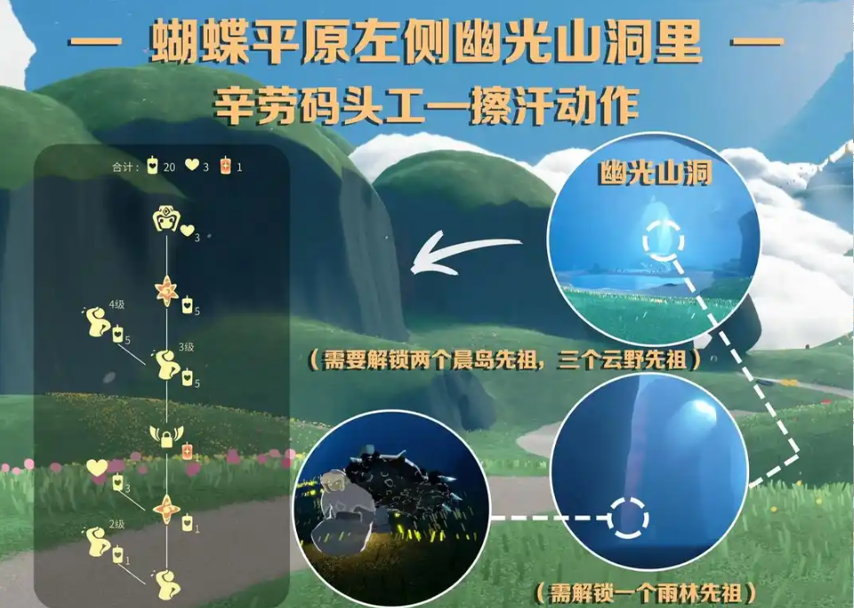 往双人门深处探索,招手和擦汗先祖正等着大家。招手动作超实用,远远看到伙伴挥挥手超暖心;擦汗动作特别适合跑图后俏皮地表达累坏啦。最特别的是举蜡烛先祖,需要几位小可爱一起合作才能唤醒,成功后就能获得举火把的动作,夜里举着温暖的火光超有安全感。鸟叫先祖会赠予清脆的鸟鸣声,飞翔时伴着清亮啼鸣,整片天空都更鲜活啦。而藏在幽光山洞的最后一位先祖,需要集齐其他伙伴才能见到,他会送出缀珠斗笠或古朴面具这类独特装扮,追求个性风格的小可爱一定会心动。