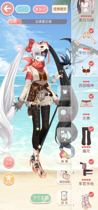 头饰建议牛仔帽·华丽(公主级3-支1进化),耳饰选用蔚海·华丽(5-支1进化),颈部佩戴沙华·珍稀(6-10关卡进化)提升性感分。手持物利刃(设计图制作)契合侠客主题,特殊饰品血枫缎(6-4掉落)可增加灵动效果。妆容推荐蜜桃甜心(服装店购买)强化可爱特质,若追求极致属性则优先选择桃夭灼华婚纱妆容。