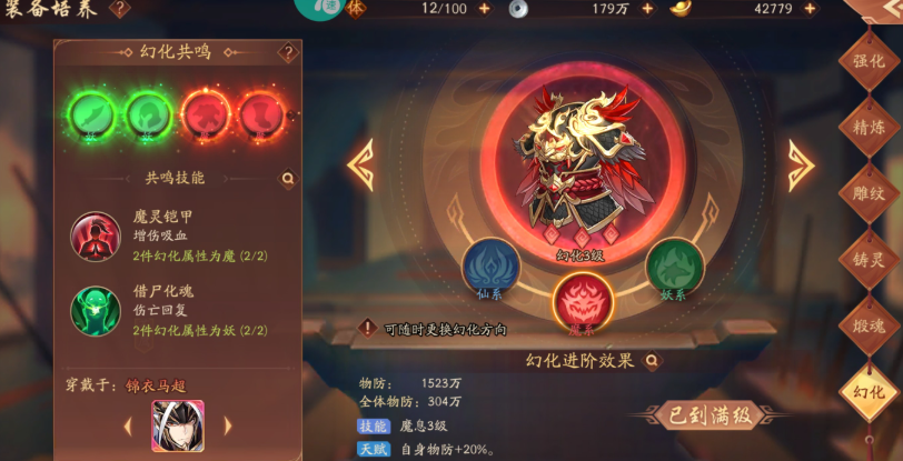 实战中,幻化策略需灵活调整以应对不同挑战,例如前排坦克的盔甲可选水系减伤提升耐久,后排输出的武器优先火系暴击增强杀伤力;装备精炼等级应领先于幻化进度,以放大属性加成效果,遇到卡关时临时切换幻化方案如给脆皮武将切换水系保命能有效破局。后期培养应注重细节优化,结合阵容需求调整幻化路线,并与军团成员交流经验避免误区,高阶幻化消耗资源大幅增加,初始阶段以性价比高的一阶幻化为主,逐步积累资源用于关键装备升阶。